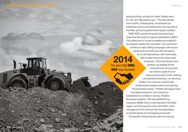 doing anything , we said we ‘ boleh ’ ( Malay word for ‘ can do ’)” Bouzigues says . “ This took almost nine months . Subsequently , we obtained our exploration permit and followed the mining code to the letter , giving the government regular updates .” SMB-WAP ’ s pooled financial resources ( Lau notes that the project ’ s capital expenditure is $ 600- 700 million ) and in-house competences enabled it to progress rapidly from this point . The consortium carried out rapid drilling campaigns with its own equipment and staff , and with the help of its on-site laboratories , staff were easily able to determine which areas were prospects . “ Once the results were positive , we applied for the mining license since we did not need to waste time for raising construction funds , seeking consultants / contractors , nor securing offtake . This came six months after obtaining the research permit and starting the production phase ,” Frédéric Bouzigues says . To enable production , the consortium established two entities in Guinea . Frédéric Bouzigues explains : “ We have Boké Mining Company ( SMB ), which mines bauxite in the Boké region , and Winning Africa Port SA ( WAP ), which manages all of the river port terminal operations on the Rio Nuñez for the shipping of bauxite .”