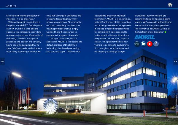 established process simulation technology , ANDRITZ is becoming a natural frontrunner of this innovation and is being considered as a pioneer in the use of real time Digital Twins for optimizing the process and to better monitor the conditions from the process point of view ,” explains Nazari . “ The plan for the next few years is to continue to push innovation through more showcases , and we ’ re going to undergo a large evolution of how the mineral processing and pulp and paper is going to work . We ’ re going to automate and then optimize as much as possible . This is what we at ANDRITZ have at the forefront of our thoughts .”