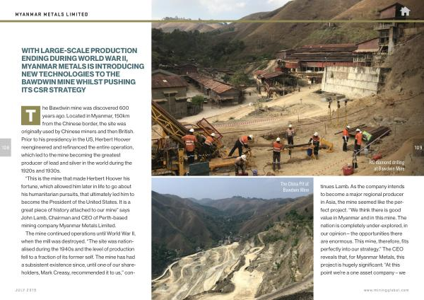 The China Pit at Bawdwin Mine tinues Lamb . As the company intends to become a major regional producer in Asia , the mine seemed like the perfect project . “ We think there is good value in Myanmar and in this mine . The nation is completely under-explored , in our opinion – the opportunities there are enormous . This mine , therefore , fits perfectly into our strategy .” The CEO reveals that , for Myanmar Metals , this project is hugely significant : “ At this point we ’ re a one asset company – we