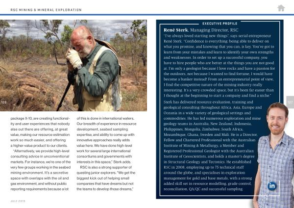 Sterk has delivered resource evaluation , training and geological consulting throughout Africa , Asia , Europe and Oceania in a wide variety of geological settings and commodities . He has led numerous exploration and mine geology teams in Australia , New Zealand , Indonesia , Philippines , Mongolia , Zimbabwe , South Africa , Mozambique , Ghana , Sweden and Mali . He is a Director , Fellow and Chartered Professional with the Australian Institute of Mining & Metallurgy , a Member and Registered Professional Geologist with the Australian Institute of Geoscientists , and holds a master ’ s degree in Structural Geology and Tectonics . He established RSC in 2008 , employing up to 75 technical staff around the globe , and specialises in exploration management for gold and base metals , with a strong added skill set in resource modelling , grade control , reconciliation , QA / QC and successful sampling .