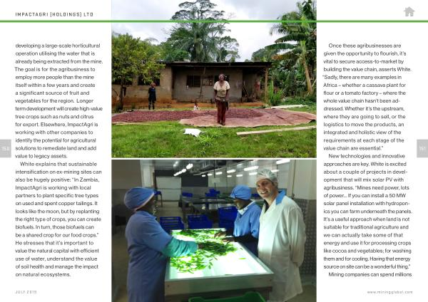 150 developing a large-scale horticultural operation utilising the water that is already being extracted from the mine . The goal is for the agribusiness to employ more people than the mine itself within a few years and create a significant source of fruit and vegetables for the region . Longer term development will create high-value tree crops such as nuts and citrus for export . Elsewhere , ImpactAgri is working with other companies to identify the potential for agricultural solutions to remediate land and add value to legacy assets .
