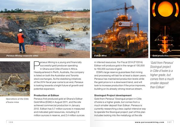 Perseus Mining is a young and financially successful gold producer operating in Ghana and Côte d ’ Ivoire in Africa . Headquartered in Perth , Australia , the company is listed on both the Australian and Toronto stock exchanges . As the stabilising initiatives of the 2014 fiscal year come to an end , Perseus is looking towards a bright future of growth and potential expansion .