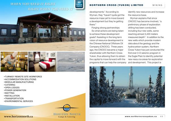 Mining developments .” According to Wyman , they “ haven ’ t quite got the resource mass yet to move toward a development but they ’ re getting there .” Forging strong partnerships So what actions are being taken to achieve these development goals ? Assisting in the long term vision of resource development is the Chinese National Offshore Oil Company ( CNOOC ). Three years ago , the CNOOC became a major shareholder with Northern Cross Yukon , thus allowing them to obtain the capital to move forward with the programs that can help the company
