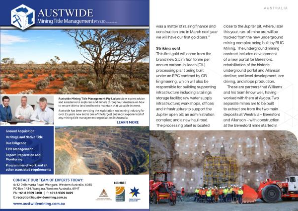 Striking gold This first gold will come from the brand new 2.5 million tonne per annum carbon-in-leach ( CIL ) processing plant being built under an EPC contract by GR Engineering , which will also be responsible for building supporting infrastructure including a tailings storage facility ; raw water supply infrastructure ; workshops , offices and infrastructure to support the Jupiter open pit ; an administration complex ; and a new haul road . The processing plant is located close to the Jupiter pit , where , later this year , run-of-mine ore will be trucked from the new underground mining complex being built by RUC Mining . The underground mining contract includes development of a new portal for Beresford , rehabilitation of the historic underground portal and Allanson decline ; and level development , ore driving , and stope production .
