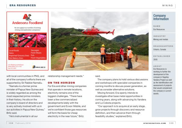 Era Resources is working to further the development of the company ’ s flagship Yandera Project as well as the identification and assessment of projects that would complement the company ’ s current assets .