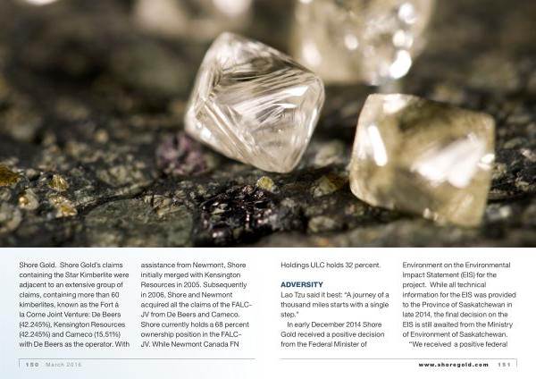 Shore Gold . Shore Gold ’ s claims containing the Star Kimberlite were adjacent to an extensive group of claims , containing more than 60 kimberlites , known as the Fort á la Corne Joint Venture : De Beers ( 42.245 %), Kensington Resources ( 42.245 %) and Cameco ( 15.51 %) with De Beers as the operator . With assistance from Newmont , Shore initially merged with Kensington Resources in 2005 . Subsequently in 2006 , Shore and Newmont acquired all the claims of the FALC- JV from De Beers and Cameco . Shore currently holds a 68 percent ownership position in the FALC- JV . While Newmont Canada FN