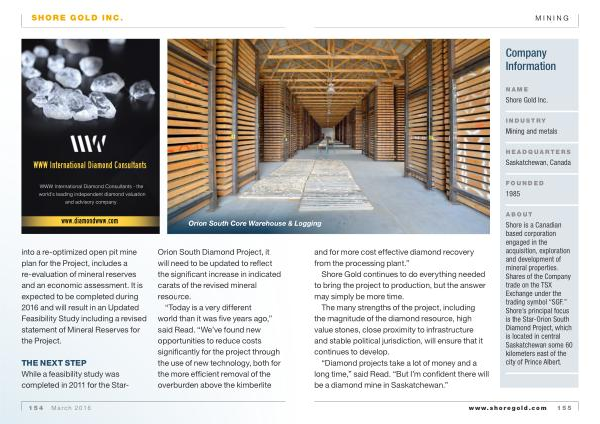 Shore is a Canadian based corporation engaged in the acquisition , exploration and development of mineral properties . Shares of the Company trade on the TSX Exchange under the trading symbol “ SGF .” Shore ’ s principal focus is the Star-Orion South Diamond Project , which is located in central Saskatchewan some 60 kilometers east of the city of Prince Albert .
