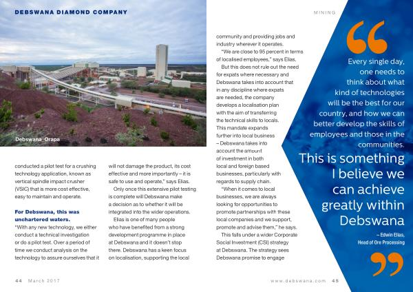 Elias is one of many people who have benefited from a strong development programme in place at Debswana and it doesn ’ t stop there . Debswana has a keen focus on localisation , supporting the local