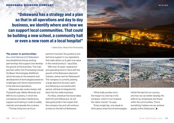 With over 45 years ’ experience and operating hand in hand with the growth of the Botswana diamond industry , where next for Debswana ? The company is currently piloting a large diamond recovery plant and following a successful pilot period , will look to integrate this plant into the wider business .