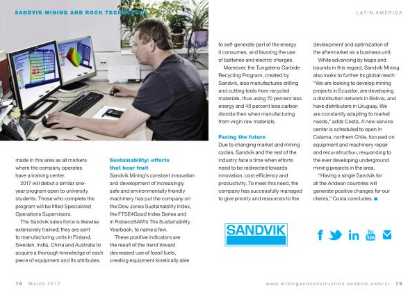 While advancing by leaps and bounds in this regard , Sandvik Mining also looks to further its global reach : “ We are looking to develop mining projects in Ecuador , are developing a distribution network in Bolivia , and have distributors in Uruguay . We are constantly adapting to market needs ,” adds Costa . A new service center is scheduled to open in Calama , northern Chile , focused on equipment and machinery repair and reconstruction , responding to the ever developing underground mining projects in the area .