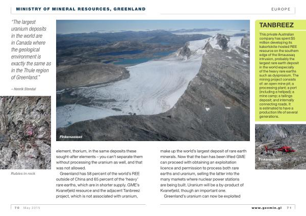 This private Australian company has spent $ 5 million developing its kakortokite-hosted REE resource on the southern edge of the Ilimaussaq intrusion , probably the largest rare earth deposit in the world especially of the heavy rare earths such as dysprosium . The mining project consists of : an open mine pit ; a processing plant ; a port ( including a helipad ); a mine camp ; a tailings deposit ; and internally connecting roads . It is estimated to have a production life of several generations . make up the world ’ s largest deposit of rare earth minerals . Now that the ban has been lifted GME can proceed with obtaining an exploitation licence and permission to process both rare earths and uranium , selling the latter into the many markets where nuclear power stations are being built . Uranium will be a by-product of Kvanefjeld , though an important one .