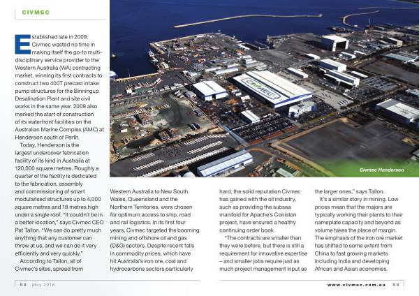Western Australia to New South Wales , Queensland and the Northern Territories , were chosen for optimum access to ship , road and rail logistics . In its first four years , Civmec targeted the booming mining and offshore oil and gas ( O & G ) sectors . Despite recent falls in commodity prices , which have hit Australia ’ s iron ore , coal and hydrocarbons sectors particularly