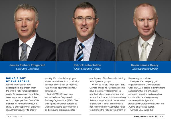 DOING RIGHT BY THE PEOPLE While diversification and geographical expansion when the time is right remain strategic goals , Tallon zealously guards his company ’ s founding principles , which put people first . One of his mantras is “ hire for attitude , not skills ,” a philosophy that plays well in Australia ’ s journey to a fairer society . If a potential employee shows commitment and positivity , any lack of skills can be rectified . “ We were all apprentices once ,” says Tallon .