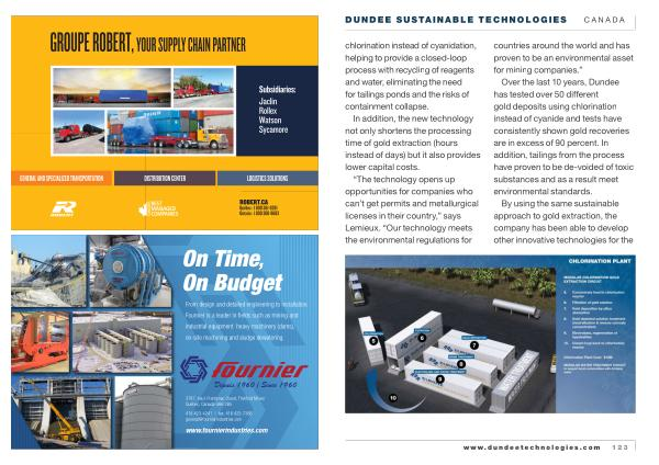 Dundee Sustainable Technologies canada chlorination instead of cyanidation , helping to provide a closed-loop process with recycling of reagents and water , eliminating the need for tailings ponds and the risks of containment collapse .