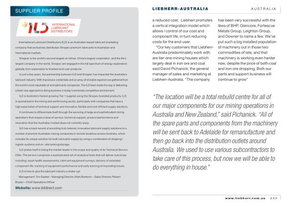 “ The location will be a total rebuild centre for all of our major components for our mining operations in Australia and New Zealand ,” said Pichanick . “ All of the spare parts and components from the machinery will be sent back to Adelaide for remanufacture and then go back into the distribution outlets around Australia . We used to use various subcontractors to take care of this process , but now we will be able to do everything in house .” www . liebherr . com . au 229
