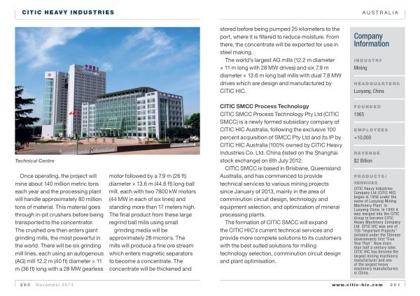 CITIC SMCC Process Technology citic smcc Process Technology Pty Ltd ( citic smcc ) is a newly formed subsidiary company of citic Hic Australia , following the exclusive 100 percent acquisition of smcc Pty Ltd and its IP by citic Hic Australia ( 100 % owned by citic Heavy Industries Co . Ltd . China ( listed on the Shanghai stock exchange ) on 6th July 2012 . citic smcc is based in Brisbane , Queensland Australia , and has commenced to provide technical services to various mining projects since January of 2013 , mainly in the area of comminution circuit design , technology and equipment selection , and optimization of mineral processing plants .