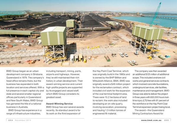 The company was then awarded an additional $ 125 million of additional scope . This included onshore civil works and general services contracts which involved concrete foundations , underground services , site facilities , maintenance and management . BMD Group was able to deliver the project in three years with 650,000 hours losttime injury ( Lti ) free with 81 percent of the workforce on the Hay Point Coal Terminal expansion project being local .