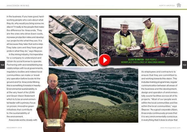 159 its employees and contractors to ensure that they are committed to and working towards this vision . This includes training programmes , regular communication between all areas of the business and the development , design and operation of environmentally sound facilities across all of its projects . “ Most of our people work within the local communities and live within the local communities ,” says Slepcev . “ As a good corporate citizen , Anaconda continuously proves that it is very environmentally conscious in everything that it does to show that
