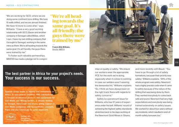 “ We are working for GCO , where we are doing some continent bore drilling . We have 15 wells drilled , and we are almost finished . We have 10 more to come after ,” says Williams . “ I have a very good working relationship with GCO , Bauer and another company in Senegal called Midas , which I own . I have my own drilling company that I brought to Senegal , working in the same mine as them . We ’ re all heading towards the same goal . It ’ s all friendly ; the guys there were trained by me .”