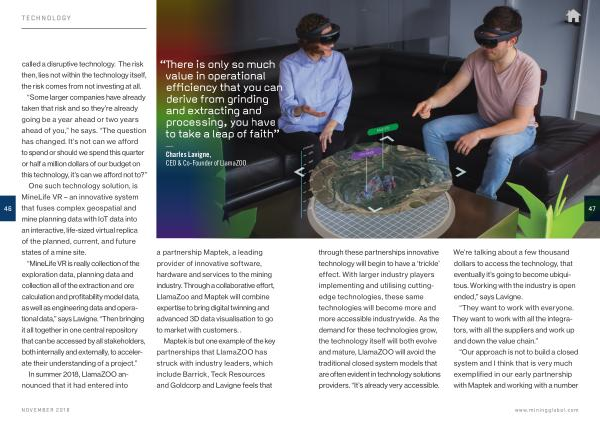 “ MineLife VR is really collection of the exploration data , planning data and collection all of the extraction and ore calculation and profitability model data , as well as engineering data and operational data ,” says Lavigne . “ Then bringing it all together in one central repository that can be accessed by all stakeholders , both internally and externally , to accelerate their understanding of a project .” In summer 2018 , LlamaZOO announced that it had entered into