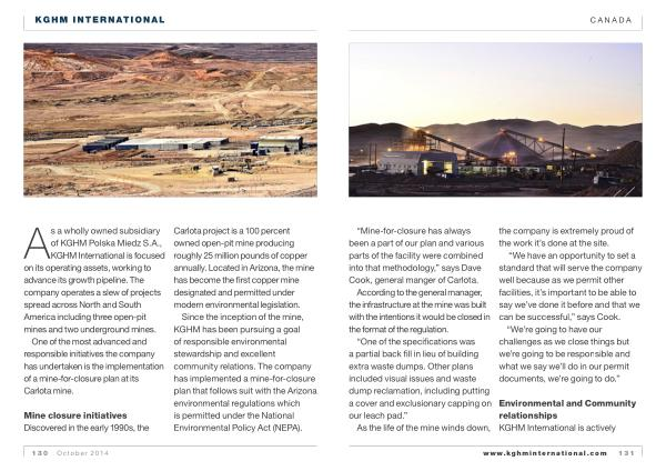As a wholly owned subsidiary of KGHM Polska Miedz S . A ., KGHM International is focused on its operating assets , working to advance its growth pipeline . The company operates a slew of projects spread across North and South America including three open-pit mines and two underground mines . One of the most advanced and responsible initiatives the company has undertaken is the implementation of a mine-for-closure plan at its Carlota mine .