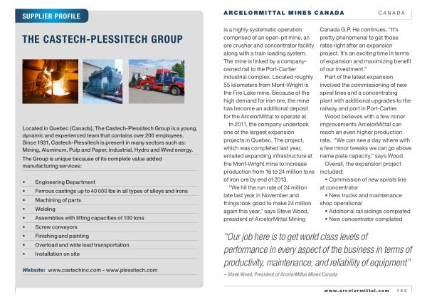 Located in Quebec ( Canada ), The Castech-Plessitech Group is a young , dynamic and experienced team that contains over 200 employees . Since 1931 , Castech-Plessitech is present in many sectors such as : Mining , Aluminum , Pulp and Paper , Industrial , Hydro and Wind energy .