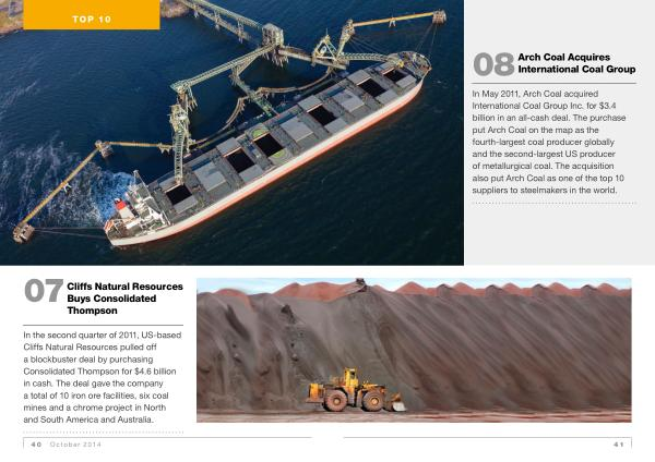 In the second quarter of 2011 , US-based Cliffs Natural Resources pulled off a blockbuster deal by purchasing Consolidated Thompson for $ 4.6 billion in cash . The deal gave the company a total of 10 iron ore facilities , six coal mines and a chrome project in North and South America and Australia . 40 October 2014