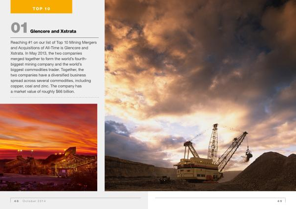 Reaching # 1 on our list of Top 10 Mining Mergers and Acquisitions of All-Time is Glencore and Xstrata . In May 2013 , the two companies merged together to form the world ’ s fourthbiggest mining company and the world ’ s biggest commodities trader . Together , the two companies have a diversified business spread across several commodities , including copper , coal and zinc . The company has a market value of roughly $ 66 billion .