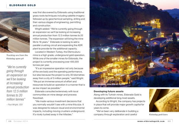 – Paul Wright , CEO was first discovered by Eldorado using traditional grass roots techniques including satellite imagery followed up by geochemical sampling , drilling and then various stages of engineering , permitting and construction .