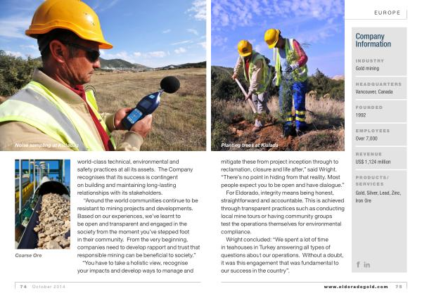 mitigate these from project inception through to reclamation , closure and life after ,” said Wright . “ There ’ s no point in hiding from that reality . Most people expect you to be open and have dialogue .” For Eldorado , integrity means being honest , straightforward and accountable . This is achieved through transparent practices such as conducting local mine tours or having community groups test the operations themselves for environmental compliance .