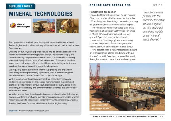 Recognised as a leader in processing solutions worldwide , Mineral Technologies works collaboratively with customers to extract value from fine minerals . Drawing on our 70 years experience and end-to-end capabilities from metallurgical testwork through plant design , equipment supply and commissioning , we provide customers with confidence in achieving successful project outcomes . Our involvement often spans multiple years across all stages of the project life cycle including optimization services that ensure ongoing operational success . We regularly assist customers with the upgrading and expansion of existing mineral processing operations , and in establishing new installations such as the Grand Cote project in Senegal . With a focus on continual improvement we proactively research and develop new equipment designs , manufacturing materials and technologies to improve throughput , grade and recovery , equipment durability , overall safety and environmental outcomes that deliver costeffective solutions .