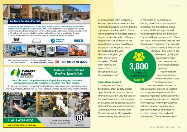 MINING and how Coupa sat in that picture . We then presented some examples relating to the people we were training – for example with workshop fitters we would focus on the types of parts they work with . We set up a Coupa blog and discussion forum on our intranet where people could find a one page ‘ how to ’ guide , print it out and put it on the wall . That was enough to get them started using the system . We tell them that you can search like you do on Google and buy like you do on eBay .”