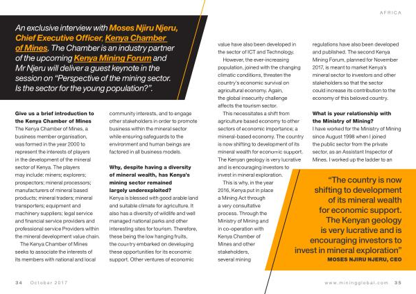 An exclusive interview with Moses Njiru Njeru , Chief Executive Officer , Kenya Chamber of Mines . The Chamber is an industry partner of the upcoming Kenya Mining Forum and Mr Njeru will deliver a guest keynote in the session on “ Perspective of the mining sector . Is the sector for the young population ?”.
