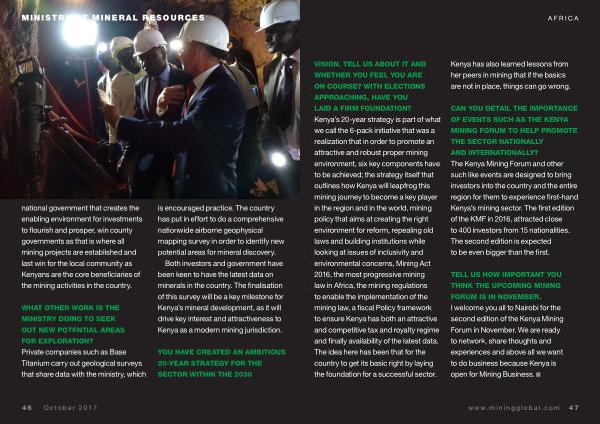 Both investors and government have been keen to have the latest data on minerals in the country . The finalisation of this survey will be a key milestone for Kenya ’ s mineral development , as it will drive key interest and attractiveness to Kenya as a modern mining jurisdiction .