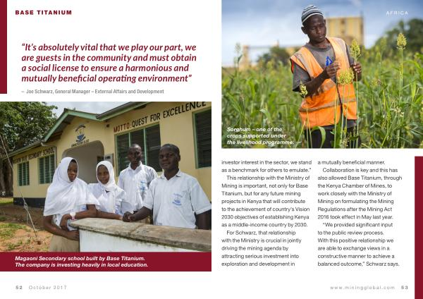 For Schwarz , that relationship with the Ministry is crucial in jointly driving the mining agenda by attracting serious investment into exploration and development in a mutually beneficial manner . Collaboration is key and this has also allowed Base Titanium , through the Kenya Chamber of Mines , to work closely with the Ministry of Mining on formulating the Mining Regulations after the Mining Act 2016 took effect in May last year .