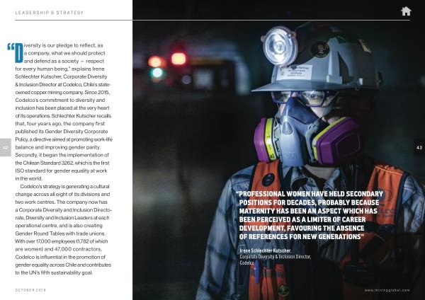 Diversity is our pledge to reflect , as a company , what we should protect and defend as a society — respect for every human being ,” explains Irene Schlechter Kutscher , Corporate Diversity & Inclusion Director at Codelco , Chile ’ s stateowned copper mining company . Since 2015 , Codelco ’ s commitment to diversity and inclusion has been placed at the very heart of its operations . Schlechter Kutscher recalls that , four years ago , the company first published its Gender Diversity Corporate Policy , a directive aimed at promoting work-life