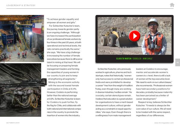 For Schlechter Kutscher ’ s team , the journey towards gender parity is an ongoing challenge . “ Although we have increased the participation of our professional female workers by four times in the past 20 years , at both operational and technical levels , the ratio remains practically the same ,” she says . “ We have a big challenge in increasing the number of female executives because there is still scarce talent in mining at that level . We will be focusing on preparing female management leaders and forming the capacities of young women in our country to join and to keep strengthening all segments .” Mining is the economic activity with the second lowest female participation in Chile at 8.4 %. However , Codelco is performing better than the national average at 9.9 %. Schlechter Kutscher is keen for Codelco to push further , fly the flag for Chile , and collaborate with both national and international companies in the country to promote the insertion of women into the industry .