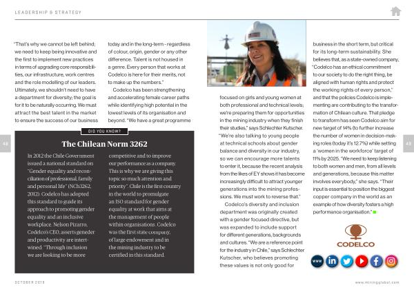 In 2012 the Chile Government issued a national standard on “ Gender equality and reconciliation of professional , family and personal life ” ( NCh3262 , 2012 ). Codelco has adopted this standard to guide its approach to promoting gender equality and an inclusive workplace . Nelson Pizarro , Codelco ’ s CEO , asserts geneder and productivity are intertwined : “ Through inclusion we are looking to be more competitive and to improve our performance as a company . This is why we are giving this topic so much attention and priority ”. Chile is the first country in the world to promulgate an ISO standard for gender equality at work that aims at the management of people within organisations . Codelco was the first state company , of large endowment and in the mining industry to be certified in this standard .