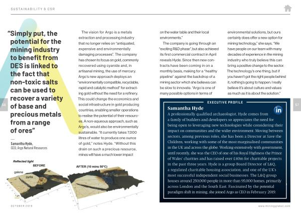 The company is going through an “ exciting R & D phase ”, but also achieved its first commercial contract in April reveals Hyde . Since then new contracts have been coming in on a monthly basis , making for a “ healthy pipeline ” against the backdrop of a mining sector which she believes can be slow to innovate . “ Argo is one of many possible options in terms of environmental solutions , but ours certainly does offer a new option for mining technology ,” she says . “ We have people on our team with many decades of experience in the mining industry who truly believe this can bring a positive change to the sector . The technology ’ s one thing , but if you haven ’ t got the right people behind it , nothing ’ s going to happen . I really believe it ’ s about culture and values as much as it is about the solution .”
