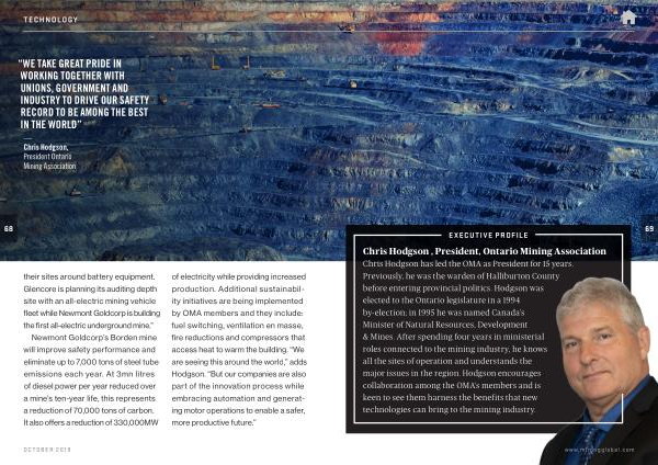 Newmont Goldcorp ’ s Borden mine will improve safety performance and eliminate up to 7,000 tons of steel tube emissions each year . At 3mn litres of diesel power per year reduced over a mine ’ s ten-year life , this represents a reduction of 70,000 tons of carbon . It also offers a reduction of 330,000MW of electricity while providing increased production . Additional sustainability initiatives are being implemented by OMA members and they include : fuel switching , ventilation en masse , fire reductions and compressors that access heat to warm the building . “ We are seeing this around the world ,” adds Hodgson . “ But our companies are also part of the innovation process while embracing automation and generating motor operations to enable a safer , more productive future .”