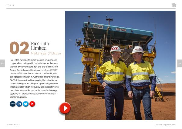 Rio Tinto ’ s mining efforts are focused on aluminium , copper , diamonds , gold , industrial minerals ( borates , titanium dioxide and salt ), iron ore , and uranium . The Anglo-Australian multinational employs 47,000 people in 35 countries across six continents , with strong representation in Australia and North America . Rio Tinto is committed to exploring the potential for new technologies and this year signed an agreement with Caterpillar , which will supply and support mining machines , automation and enterprise technology systems for the new Koodaideri iron ore mine in Western Australia . OCTOBER 2019