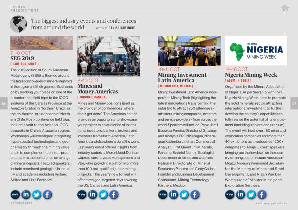 Mines and Money positions itself as the provider of conferences ‘ where deals get done ’. The Americas edition provides an opportunity to showcase your project to an audience of institutional investors , bankers , brokers and investors from North America , Latin America and elsewhere around the world . Last year ’ s event offered insights from industry leaders at Murenbleed , Denham Capital , Sprott Asset Management and Vale , while providing a platform for more than 100 pre-qualified junior mining projects . This year ’ s new format will offer three geo-targeted days covering the US , Canada and Latin America . OCTOBER 2019